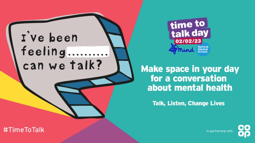 On Thursday 2 February 2023, the nation will be celebrating Time to Talk Day, a day about creating supportive communities by having conversations with family, friends, or colleagues about mental health. We all have mental health, so by talking about it we can support ourselves and others!