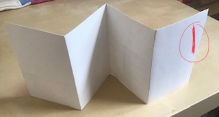 To make the accordion book: size-wise, it doesn’t matter, but my suggestion is to use a piece of heavy paper (eg watercolour paper if you have it) or lightweight card, approx 4” x 16”. You can stick two shorter pieces together if necessary. This will give you a book with four pages, all four inches square – but make it bigger or smaller, as you wish. Take the strip of paper and fold it in half so you have a nice crisp fold in the centre, then turn it over and fold both outer edges to the centre to form two more folds. This makes the zigzag form with four “pages” that will stand up on its own (see pic 1 of book with blank pages) or can be folded back on itself (if, say, you want to put it in an envelope).