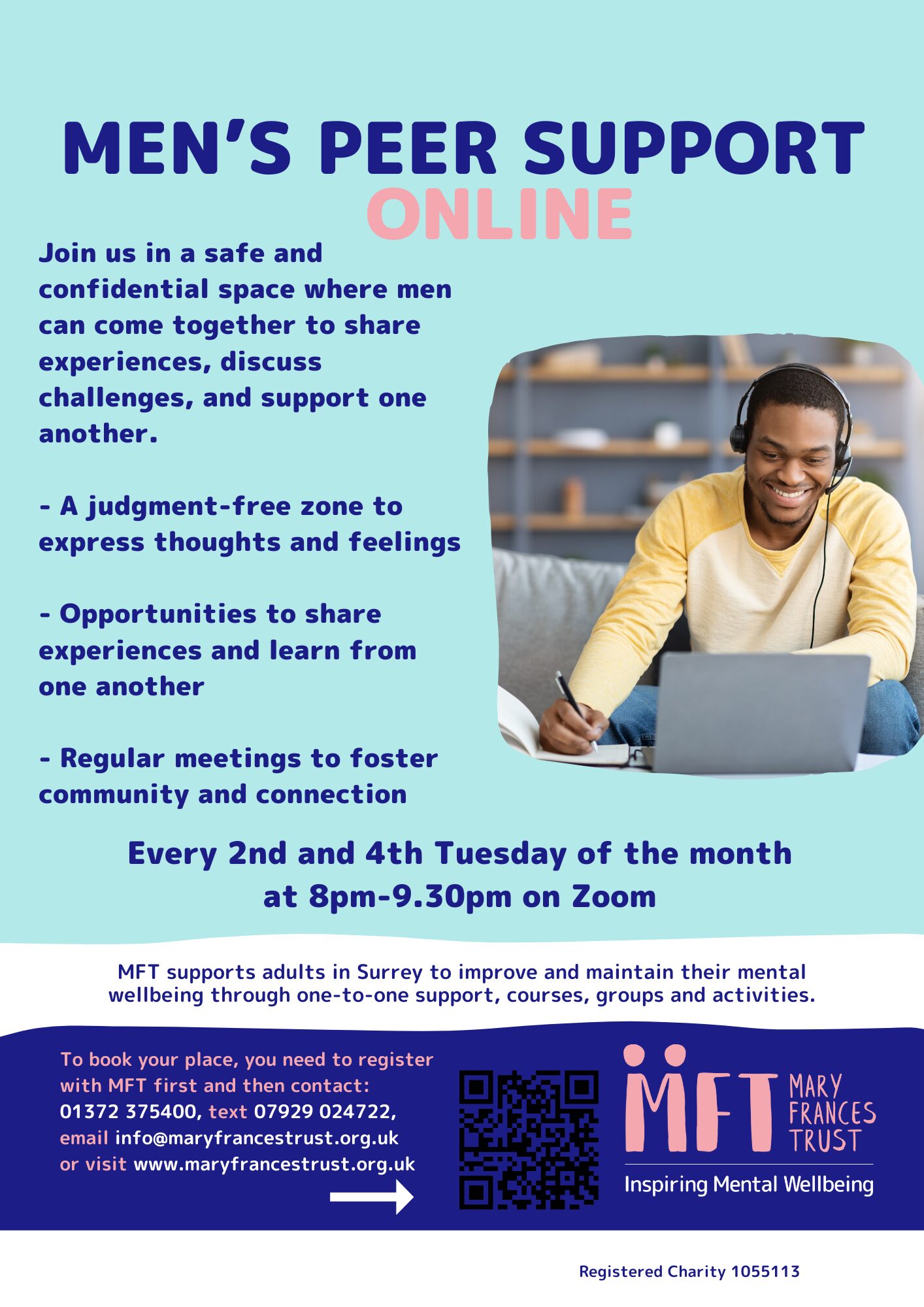 Men’s Peer Support Group – Weekly on Thursdays, from 7.30pm-8.30pm. In Leatherhead. View our poster.
